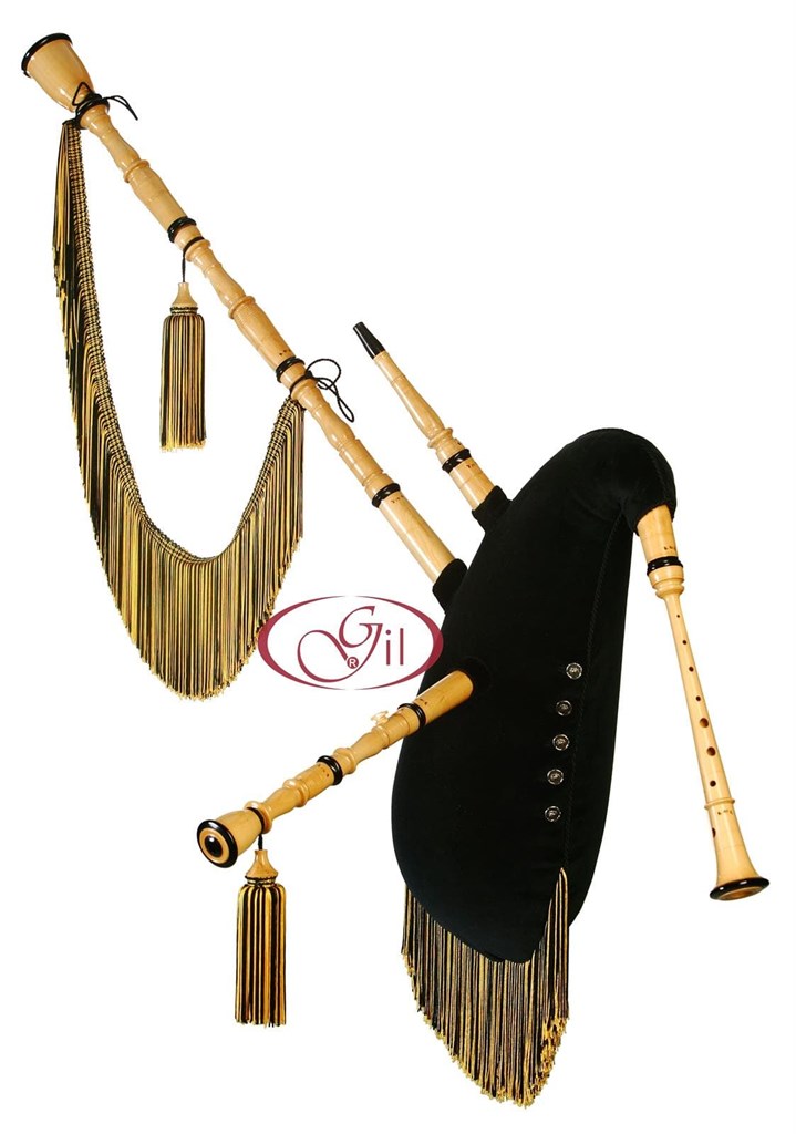 Gaita de madera de Boj con ronquilla, anillada en metacrilato de color negro. Funda de terciopelo de color negro y flecos negros. Si se pide, puede llevar zonas quemadas.